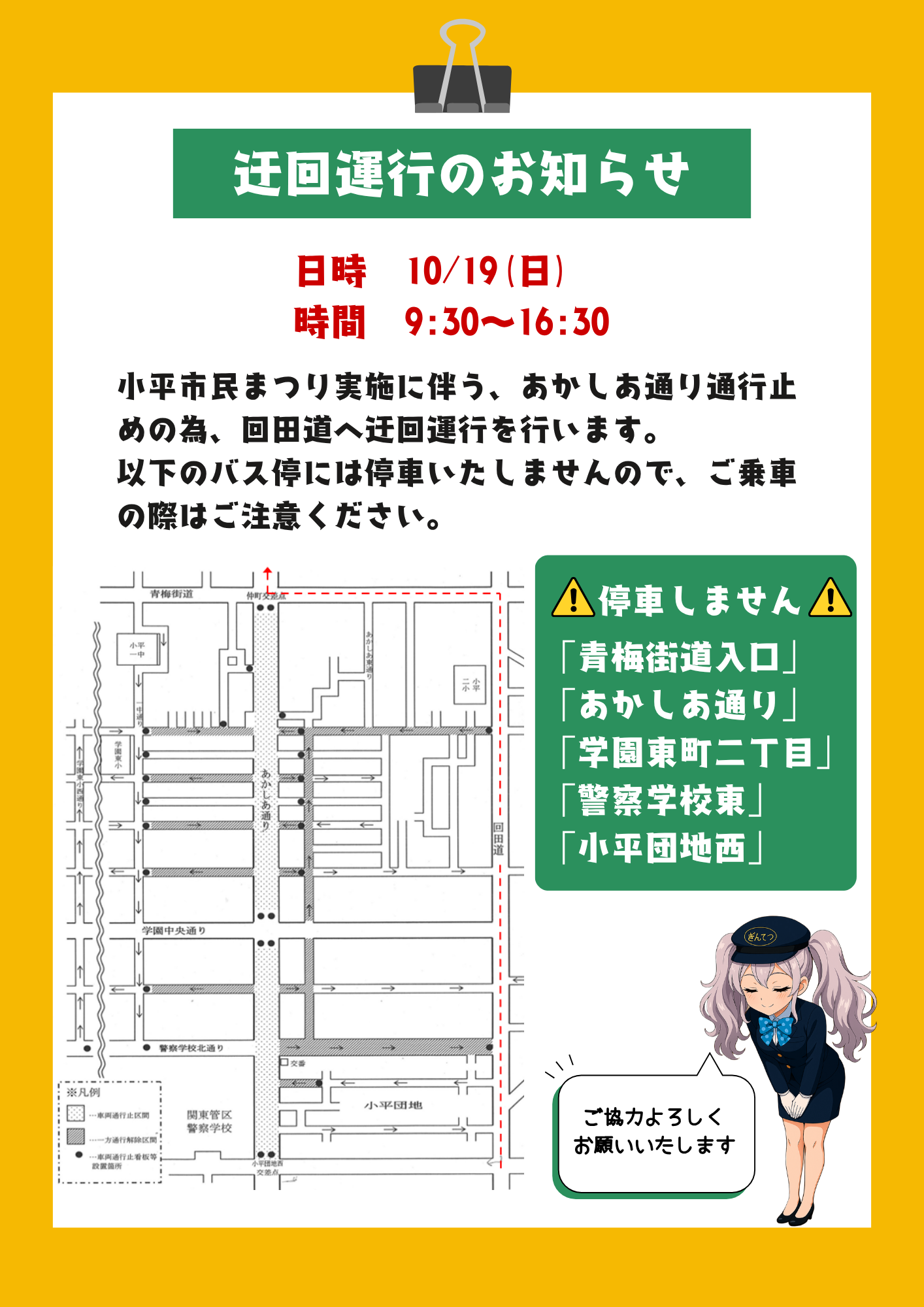 2025.10.07 重要なお知らせ 10月19日(日) 小平市民まつり 迂回運行のお知らせ 【迂回運行のお知らせ】 日時 令和7年10月19(日) 時間 9:30~16:30 『小平市民まつり』実施に伴う、「あかしあ通り」通行止めの為、迂回運行を行います。 その為、「青梅街道入口」「あかしあ通り」「学園東町二丁目」「警察学校東」「小平団地西」には停車致しませんので、ご乗車の際はご注意下さい。 一覧へ戻る