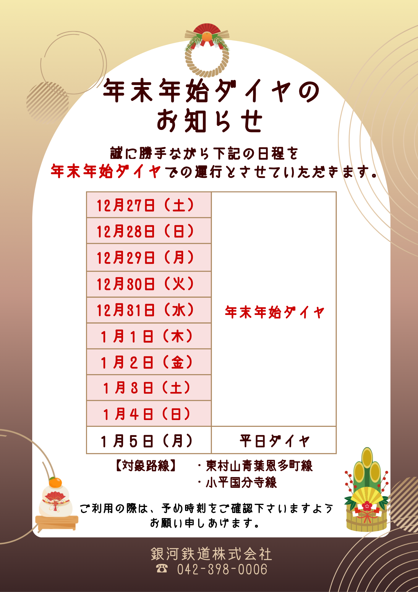 2025年12月27日から2026年1月4日までの間は【年末年始ダイヤ】にて運行させていただきます。